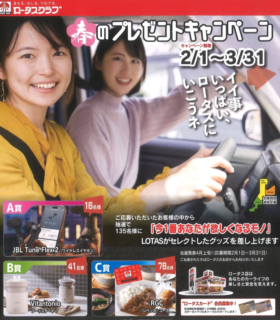 春のプレゼントキャンペーン開催中!! 2026.02.02 只今、春のプレゼントキャンペーン開催中です🌸🌸🌸 抽選で135名様にロータスがセレクトしたグッズを プレゼントします🎁 ぜひ、ご来店時にご応募下さい !! 社員一同お待ちしております😊
