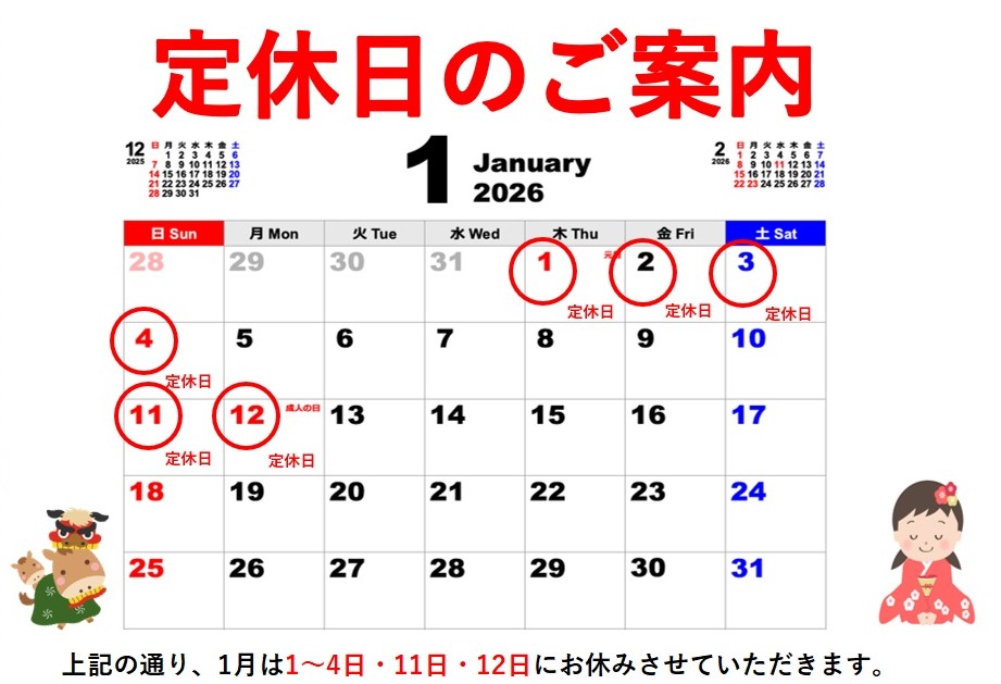 1月定休日のご案内