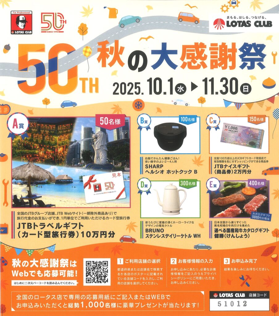 50周年 秋の大感謝祭 開催中!! 2025.10.01 10/1~11/30まで、秋の大感謝祭を開催しております! 総勢1000名様に豪華プレゼントが当たります! WEBでも応募可能です☆ 是非、ご応募ください♪